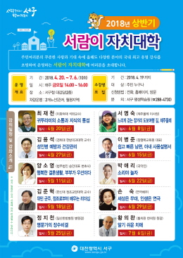 서구는 올해 수강생의 관심과 호응도가 높은 5개 분야(▲건강 분야 ▲교양 분야 ▲인문분야 ▲법률 분야 ▲역사 분야)의 수준 높은 강사를 초빙해 오는 10월까지 총 16회에 걸쳐 서람이자치대학을 운영할 계획이다. 상반기 강의는 내달 6일까지이며, 하반기는 9월 7일부터 시작된다. 강의는 매주 금요일 오후 2시 구청 대강당에서 진행된다.