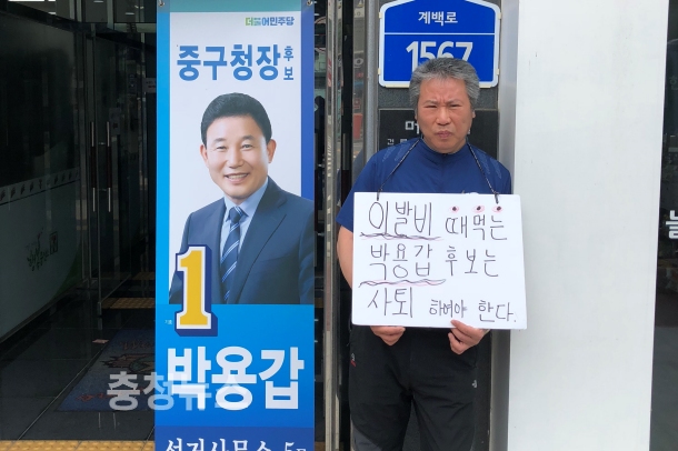 11일 박용갑 후보 사무소 앞에서 피켓을 들고 1인시위 하는 이용원 대표 권 씨
