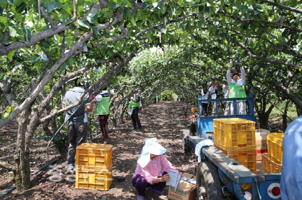임직원 50여 명 관평동 배, 포도 재배 농가 찾아 일손 도와