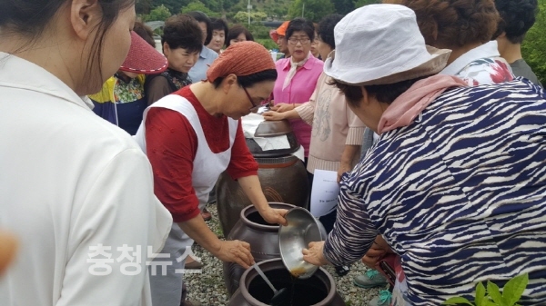 이날 현장교육은 지난 3월 충청남도여성사회참여확대 사업의 일환으로 실시한 장담그기에 참가한 회원들로 충남도내 15개 시군에서 장을 담그고 장 가르기를 거쳐 10월 전통장 품평회 출품을 위해 숙성과정을 진행하고 있다.