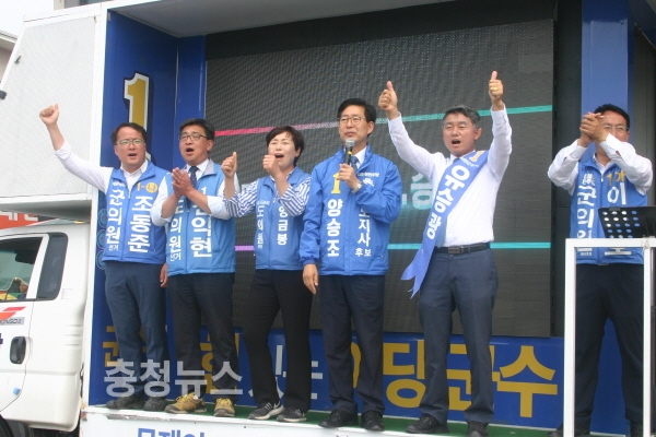 양 후보는 이날 유세에서 “양승조와 유승광을 선택하는 것은 문재인 대통령을 선택하는 것과 같다”며 “충남에 기업을 유치하고 혁신도시 지정을 받아내 경제를 살릴 것”을 약속했다.