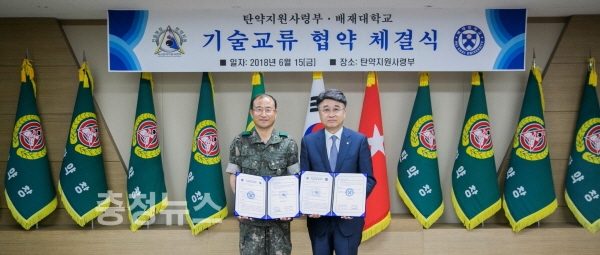 배재대(총장 김영호)와 육군 탄약지원사령부(사령관 준장 강재구)는 15일 대전 탄약사에서 탄약분야 기술교류협약을 체결했다. 이번 협약은 탄약기술 발전‧연구 향상을 도모해 대학 발전과 군 전투력 향상에 기여하기 위해 마련됐다.