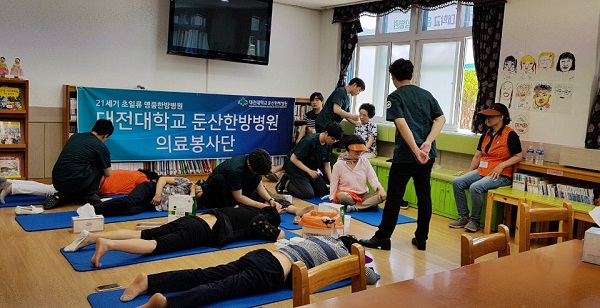 이번 봉사는 대전대 링크플러스 사업의 지원을 받았으며, 옥천군 군서면 지역주민들이 참여하는 총동문 축제의 일환으로 군서초등학교에서 진행됐다. 이날 의료봉사는 150여 명의 옥천군 지역민들을 대상으로 침과 뜸치료, 물리치료, 우황청심원 등 한방제제 약물 및 한방파스 등의 처방이 이뤄졌다.