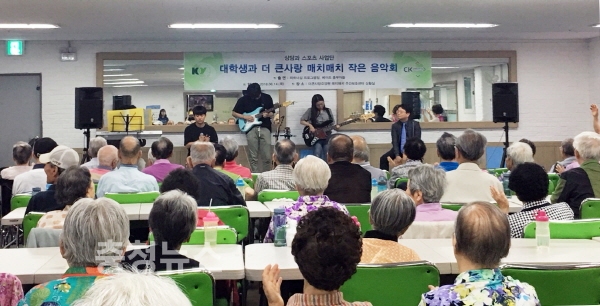 하지만 한 학기 동안 열심히 6곡의 노래를 연습했고, 그 결과 지난 14일 대학 근처 노인요양시설인 ‘더큰사랑요양원’의 ‘매치매치 주간노인보호시설’의 어르신들을 대상으로 작은 공연을 진행했다.