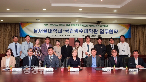 남서울대학교(총장 공정자)가 국립광주과학관(관장 김선아)과 19일 남서울대 지식정보관에서 가상증강현실 콘텐츠의 개발과 활용을 통해 과학문화를 확산하기 위한 상호 업무협약을 체결했다.