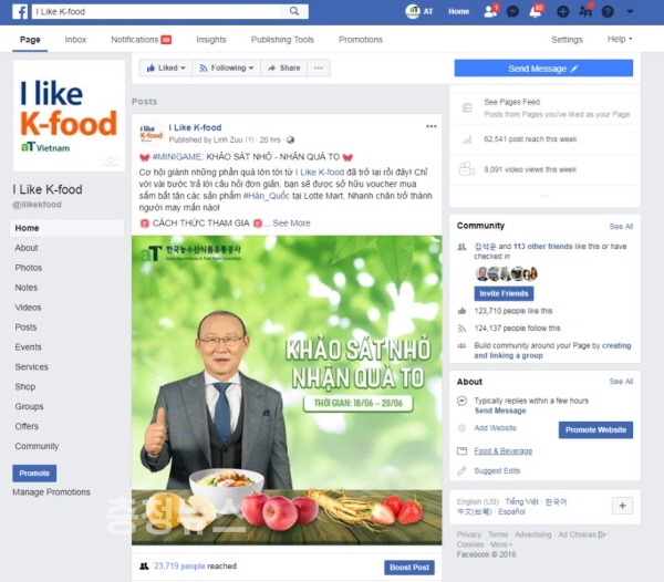 베트남에서는 팔로워가 12만 3천명에 이르는 aT 페이스북 팬페이지(I Like K-Food)를 통해 한국 농식품 활용 레시피 등을 홍보하고 현지에서 가장 인기 있는 온라인 시트콤을 활용한 한국 농식품 홍보로 현지 젊은 소비자층의 큰 인기를 얻고 있다.