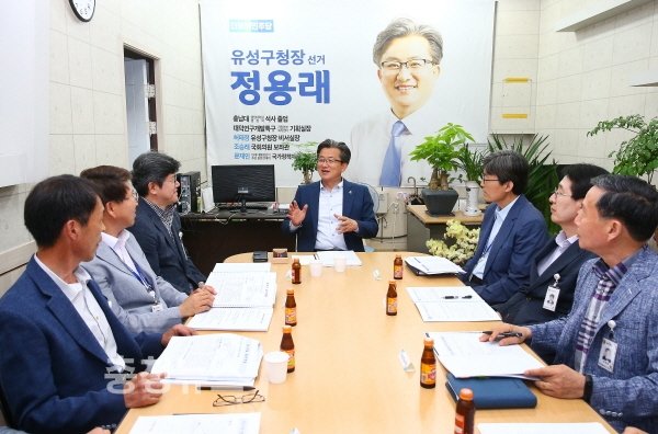 정용래 유성구청장 당선인이 20일 당선인 사무실에서 구 현안사업 및 하반기 당면업무 등 주요업무보고를 받고 본격적인 민선7기 준비에 나섰다.