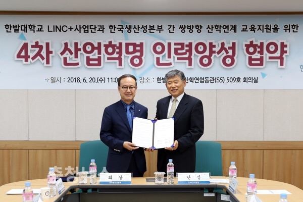 한밭대 사회맞춤형 산학협력 선도대학 육성사업단(LINC+사업단, 단장 차동진)과 한국생산성본부(회장 노규성) 간 이뤄진 이 협약은 스마트팩토리 등 4차 산업혁명 전문인력 교육을 위한 교육과정 개발과 운영에 상호 협력해 4차 산업혁명 관련 산업발전에 기여할 목적으로 추진됐다.