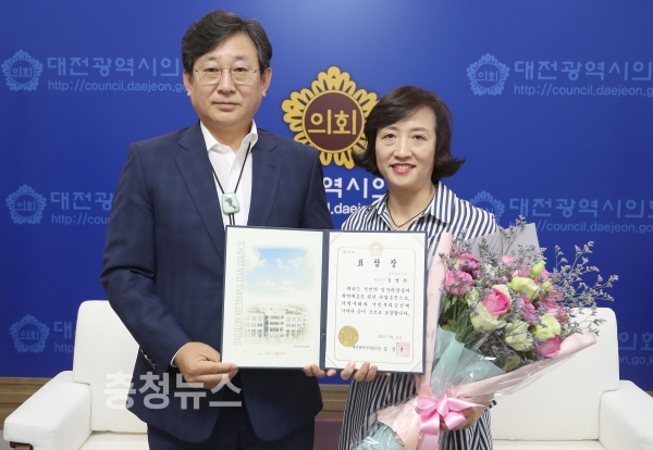 대전시의회 김경훈의장은 평소 시민의 일자리 창출과 취약계층 지원에 힘쓴 공로를 인정해 ㈜미성씨앤씨 김명희 대표에게 21일 의장실에서 150만 대전 시민을 대표하여 표창장을 수여했다.