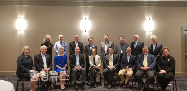 지난 3월 미국 뉴올리언즈 하얏트 센트릭호텔에서 열린 '2018 APCU 총회'에 참석한 회원대학 총장들. 뒷줄 왼쪽 네번째가 한남대 이덕훈 총장.