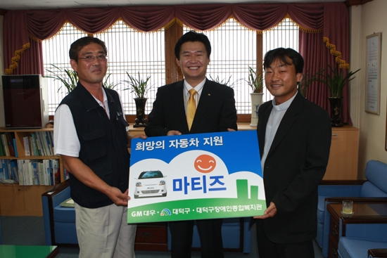이날 GM대우 한마음재단은 마티즈 차량 1대(싯가 800만원 상당)를 사회복지단체인 대덕구장애인종합복지관(관장 나봉균)에 기증했다.