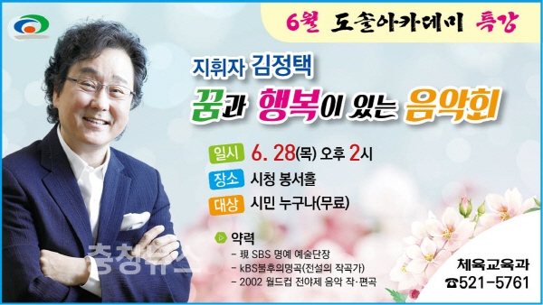 이번 특강은 ‘꿈과 행복이 있는 음악회’라는 주제로 김정택 SBS 명예 예술단장이 아름다운 피아노 연주와 함께 호흡하며 즐겁고 감동이 넘치는 강의를 진행할 예정이다.