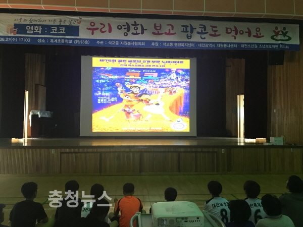 이번 영화 관람은 대전시 자원봉사지원센터의 협조와 옥계초등학교(교장 노한래)의 장소제공으로 성사됐다. 많은 주민의 참여를 위해 행정복지센터에선 한 달전부터 열띤 홍보작전에 들어갔다.
