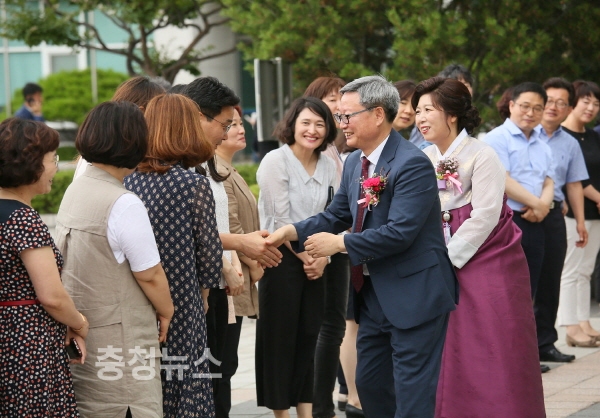 대전 서구 강철식 부구청장이 직원들과 일일이 악수를 나누며 떠나는 모습
