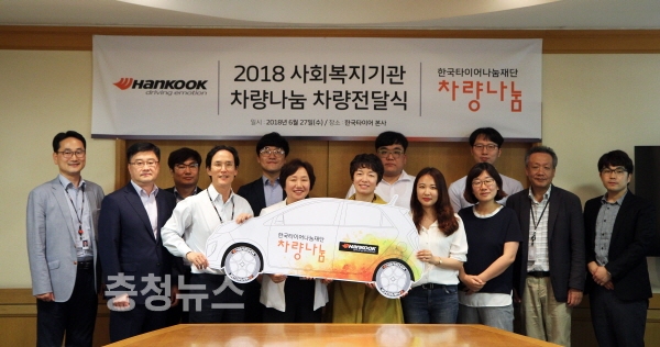 한국타이어(대표이사 조현범)의 사회공헌재단인 한국타이어나눔재단이 지난 27일 한국타이어 본사에서 ‘2018 사회복지기관 차량나눔’ 차량 전달식을 진행했다.