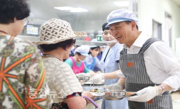 본격적인 민선 7기의 문을 열게 된 구본영 시장은 임기 첫날인 2일 천안시노인종합복지관을 방문해 부인 정혜정씨와 다사랑봉사단, 여성단체협의회, 어린이안전학교 회원들과 함께 배식 봉사를 펼쳤다.