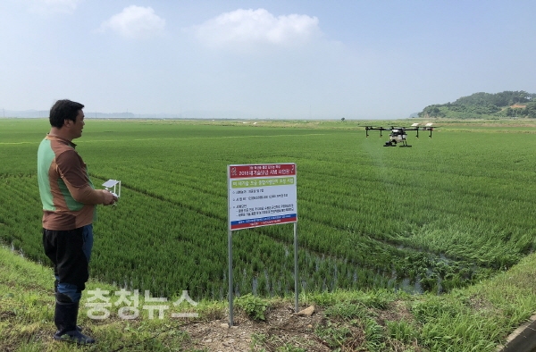 당진시 대호지면 조금리 최재신 농가를 대표로 모두 5농가가 참여한 이번 시범사업은 노동력 절감과 해나루쌀의 품질 고품질화를 위한 영양제 살포와 돌발 병해충의 적기 방제를 위해 추진됐다.