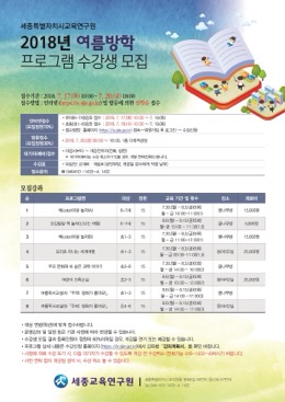 세종시교육연구원(원장 김상학)은 오는 17일부터 유아·초등학생을 대상으로 하는 ‘여름방학 프로그램’ 수강생을 모집한다고 3일 밝혔다.