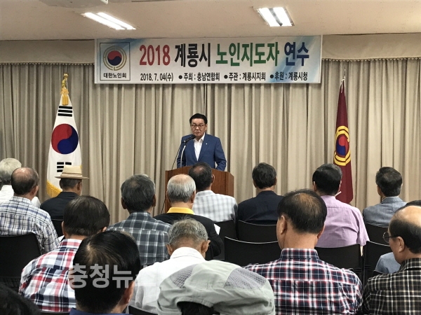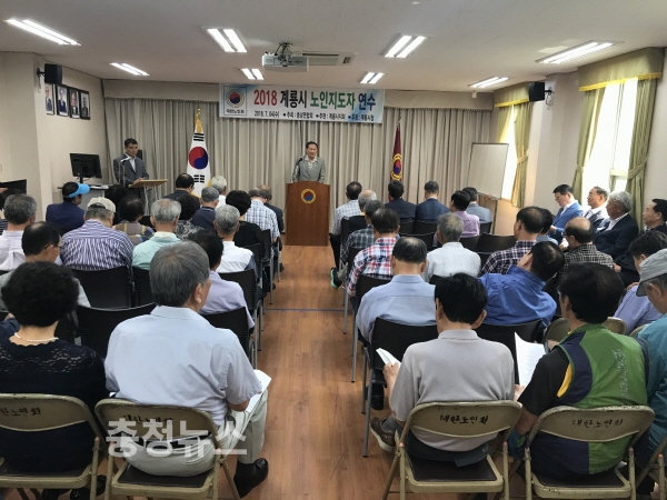 계룡시(시장 최홍묵)는 4일 대한노인회 계룡시지회 회의실에서 대한노인회 계룡시지회 임원, 분회장, 경로당회장 등 100여 명이 참석한 가운데 2018년 노인지도자 연수 교육을 실시했다.