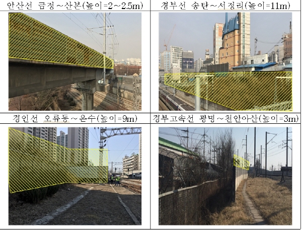 또한, 열차운행 중 발생되는 소음을 측정한 결과 소음기준을 초과한 경부선 송탄∼서정리 구간(길이 87m, 높이 11m), 경인선 오류동∼온수 구간(길이 246m, 높이 9m), 경부고속선 광명∼천안아산(길이 104m, 높이 3m) 구간에 방음벽을 각각 신설한다.