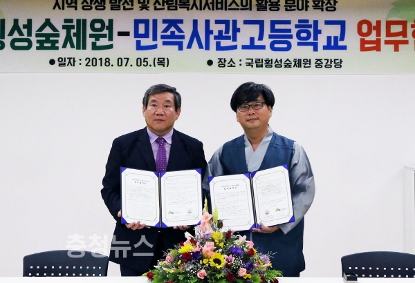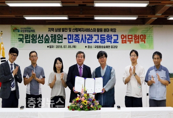 산림청 한국산림복지진흥원(원장 윤영균)은 5일 소속기관인 국립횡성숲체원(원장 장관웅)이 강원 횡성군 둔내면 국립횡성숲체원 중강당에서 민족사관고등학교(교장직무대리 최관영)와 ‘지역 상생발전과 산림복지서비스 분야확장을 위한 업무협약(MOU)’을 체결했다고 밝혔다.