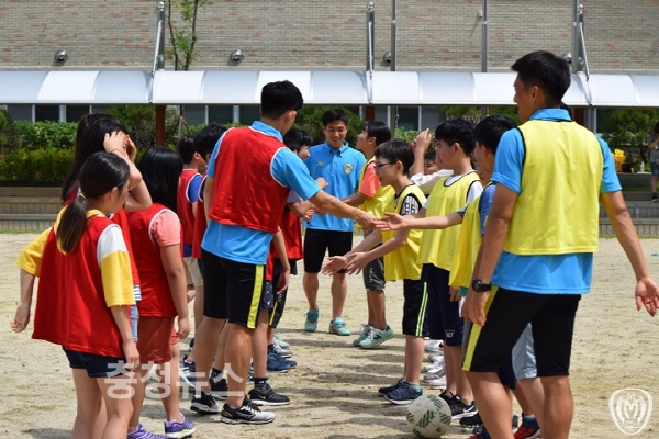 본격적인 프로그램 진행에 앞서 부상 예방을 위한 스트레칭을 시작으로 학생들이 공과 쉽게 친해질 수 있게 간단한 레크리에이션 및 슈팅, 미니 게임 등을 진행하며 이날만큼은 선수가 아닌 선생님으로서의 면모를 보였다.