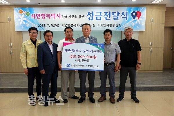 충남 서천군 서부수협 김양식협의회(회장 김명규, 이하 협의회)는 지난 5일 서면 행복택시 운영을 위한 성금 1000만 원을 서면사랑후원회(회장 김형천)에 전달했다.