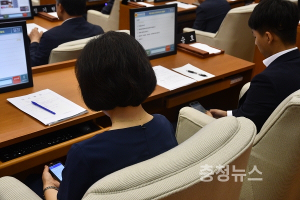 대전시의회 본회의 첫날인 6일 민주당 소속 일부 초선의원들이 회기 중 SNS와 인증샷 찍기에 빠져 비난을 자초하고 있다.