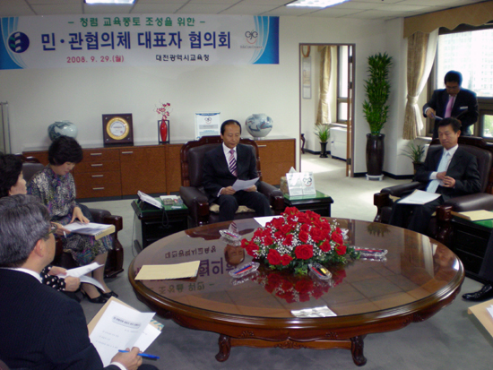 시교육청은 29일 회의실에서 대전참여자치시민연대, 대전 YMCA, 전국주부교실 대전지부 등 8개의 학부모 및 시민단체 대표들로 구성된 민ㆍ관협의체와 청렴한 대전교육을 구현하기 위해 전국최초 청렴 교육풍토 조성을 위한 민·관 협의체를 출범했다고 밝혔다.