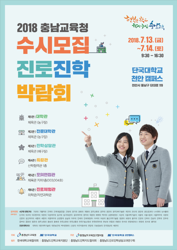 충남교육청(교육감 김지철)은 단국대학교와 공동으로 13일과 14일 이틀간 단국대학교 천안캠퍼스에서 '충남도교육청 2018 수시모집 진로진학박람회'를 개최한다고 6일 밝혔다.