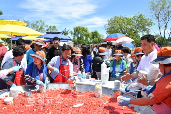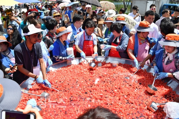 충남 부여군(군수 박정현)은 제16회 서동연꽃축제에서 농협중앙회 부여지부와 함께 굿뜨래 10미로 유명한 부여 대표농산물 수박을 이용해 수박화채 만들기 행사를 지난 8일 가졌다.