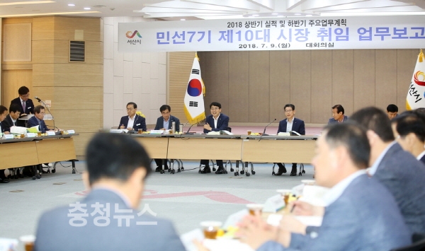 충남 서산시는 9일 시청 대회의실에서 맹정호 시장과 각 부서 간부공무원을 비롯한 직원 200여명이 참석한 가운데 ‘민선7기 제10대 시장 취임 업무보고회’ 를 가졌다고 밝혔다.
