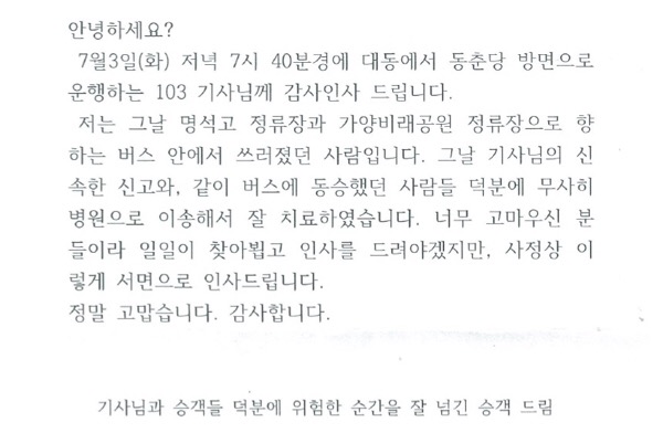A씨는 감사편지를 통해 “기사님의 신속한 신고와 같이 버스에 동승했던 사람들 덕분에 위험한 순간을 잘 넘겼다”며 “일일이 찾아뵙고 인사를 드려야 하지만 사정 상 서면으로 인사드린다”고 고마운 마음을 전했다.