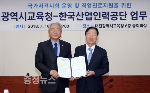 대전시교육청(교육감 설동호)은 10일 시교육청 6층 중회의실에서 한국산업인력공단과 국가자격시험 운영 및 직업진로지원을 위한 업무협약(MOU)을 체결했다.