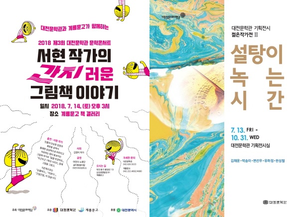 대전문화재단이 운영하는 대전문학관(관장 박진용)은 성큼 다가온 여름을 시원하게 맞이하는 2018년 두 번째 기획전시「젊은작가전Ⅱ- 설탕이 녹는 시간」과 대전의 대표 서점 계룡문고와 함께하는 문학콘서트 「서현 작가의 간지러운 그림책 이야기」를 개최한다.