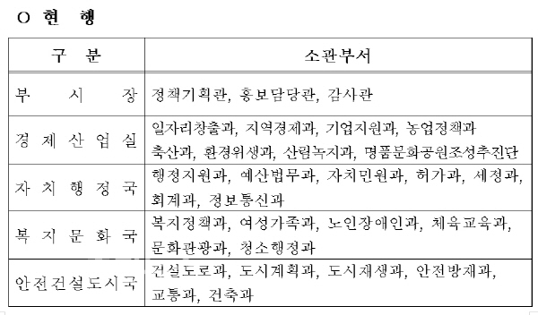 정원은 현행 1,978명에서 44명을 증액한 2,022명이고 행정기구는 다음과 같이 변경하기 위해 천안시에서 조례안 일부개정을 제출했다.