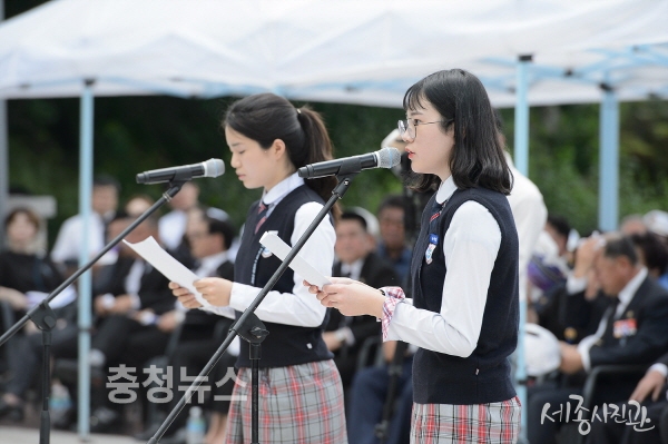 한솔고등학교(교장 유인식)는 11일 세종시 전동면 개미고개에서 열린 ‘제13회 개미고개 6ㆍ25 격전지 추모제’에 한솔고 공공외교동아리 ‘투월드’(회장 안예현 학생) 학생들이 “6.25 전쟁에 참전해 개미고개 전투에서 전사한 미군 참전 용사들에게 바치는 감사 편지를 낭독하는 시간을 가졌다”고 12일 밝혔다.
