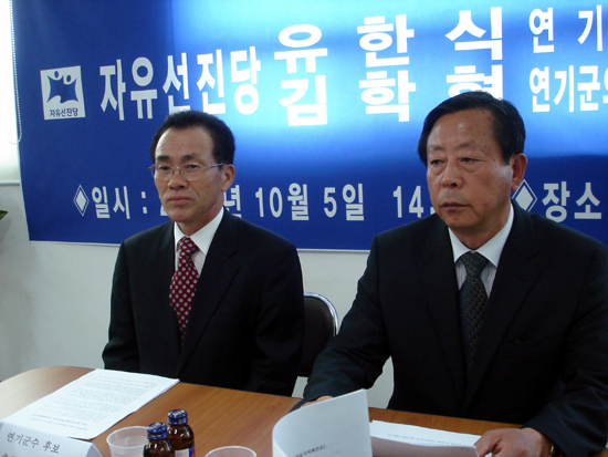 오는 10월29일 선진당 유한식 연기군수 후보 와 김학현 연기군 가 선거구 군의원 후보는 이날 기자회견에서 " 이번 선거는 연기군의 미래를 결정하는 중요한 선거라"며 '반듯시 승리할 것을 약속드리겠다"고 말했다.