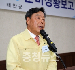 제70회 충남도민체전 D-60 준비상황보고회에서 가세로 태안군수가 인사말을 하고 있다.