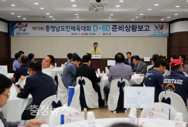 군은  13일 군청 중회의실에서 가세로 군수를 비롯한 군 관계자와 도민체전 준비위원회, 도민체전 자문위원회, 도민체전 민간협력위원회, 도민체전 대회준비단, 관내 대표봉사단체 관계자 등 90여 명이 참석한 가운데 ‘제70회 충남도민체육대회 D-60 준비상황 보고회’를 개최했다고 밝혔다.