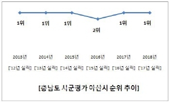한편, 아산시는 ‘18년 정부합동평가에서 17개 광역단체 중 충남도가 전국1위 성적 달성에 일익을 담당했다. 충남도는 도와 시군(市郡) 실적을 합산해 정부합동평가에 대응하는 체계이다.
