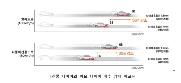 실제로 한국타이어에서 실험한 결과에 따르면, 젖은 노면에서 시속 100km 이상 달리다가 급제동 시 홈의 깊이가 7mm인 새 타이어를 장착했을 때와 홈의 깊이가 1.6mm로 심하게 마모된 타이어는 제동력이 약 2배 가까이 차이 났다. 또한 시속 80km로 코너링 했을 경우 마모 상태가 거의 없는 새 타이어는 2~3m 반경 안에서 미끄러지는 데 반해, 마모 정도가 심한 타이어는 도로 밖으로 이탈하는 등 위험성이 극명하게 드러났다.