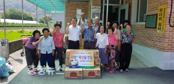 농협 충남지역본부(본부장 조소행)는 17일 초복을 맞이해 명예이장으로 결연을 맺은 금산군 추부면 서대2리(이장 김지식) 마을을 찾아 사랑의 축산물을 전달하고 마을 주민들과 함께하는 시간을 가졌다.