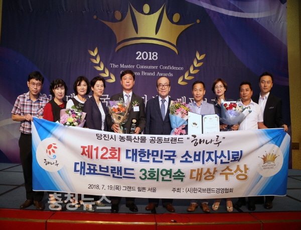 충남 당진시 농특산물 공동브랜드인 ‘해나루’가 19일 서울 밀레니엄 힐튼 호텔에서 열린 제12회 2018 대한민국 소비자신뢰 대표브랜드 대상에서 3년 연속 대상을 차지하는 쾌거를 이뤘다.