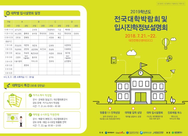 대전시교육청(교육감 설동호)은 21~22일까지 대전켄벤션센터(DCC)에서 ‘2019학년도 전국대학박람회 및 대입진학정보설명회’를 개최한다고 19일 밝혔다.