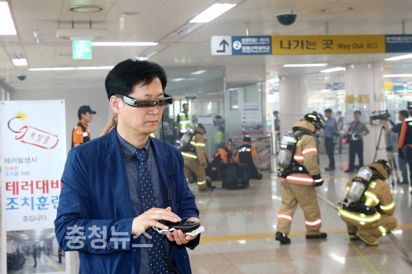 지난 5월 17일 지족역에서 진행된 유성구 ‘2018 재난대응 안전한국 훈련’ 현장 훈련 모습 (스마트글래스)
