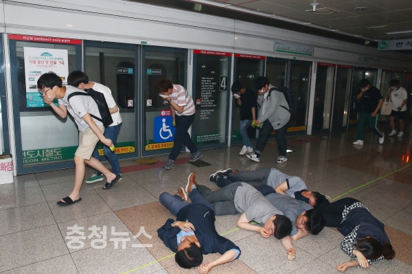 지난 5월 17일 지족역에서 진행된 유성구 ‘2018 재난대응 안전한국 훈련’ 현장 훈련 모습