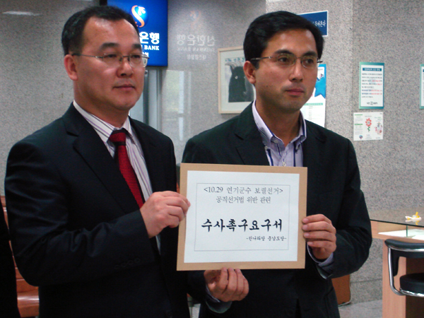 한나라당 충남도당(위원장 김태흠)은 10월 29일 연기군수 보궐선거를 앞두고 연기군 선관위에서 연기경찰서에 수사의뢰한 공직선거법위반(여론조사의 결과공표 금지 등)에 대한 수사가 지지부진함에 따라 대전지방검찰청에 직접수사를 촉구요구서를 접수했다.