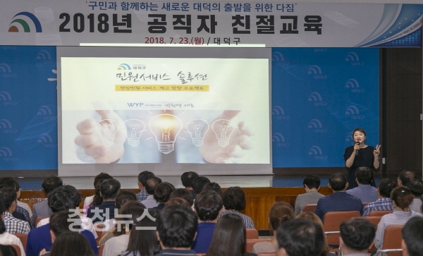대덕구(구청장 박정현)가 지난 23일 구청 청렴관에서 공직자 300여명을 대상으로 친절교육을 실시했다.