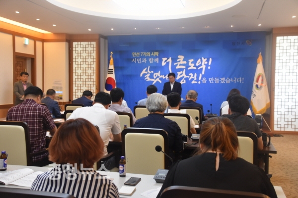 김홍장 당진시장이 25일 당진시청 해나루홀에서 민선7기 첫 기자회견을 갖고 시정운영 방향을 밝혔다.